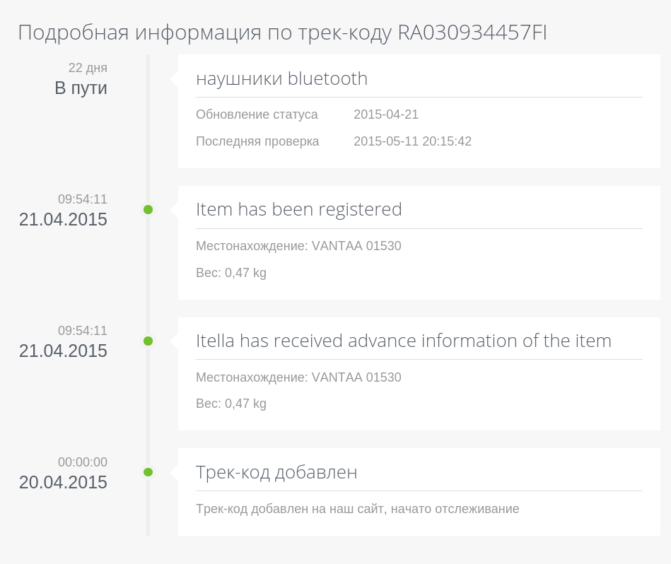 Посылка уже в Санкт-Петербурге, а на postchecker числится "registered in Finland" или как-то так. По данным 17трек посылка вроде как 3 дня в России уже.